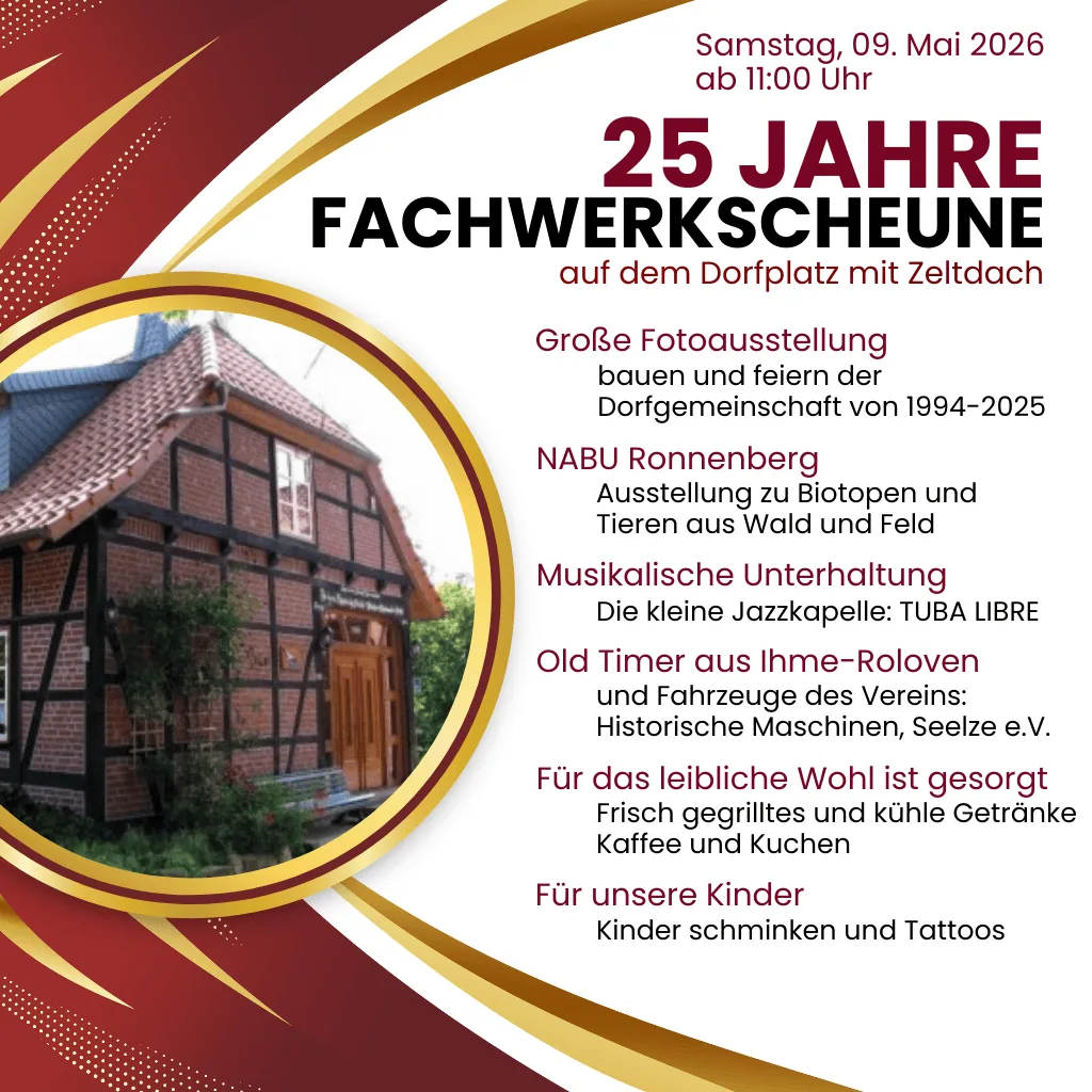 Am Samstag, dem 9. Mai 2026, feiern wir ab 11:00 Uhr auf dem Dorfplatz in Ihme-Roloven unser großes Jubiläum.