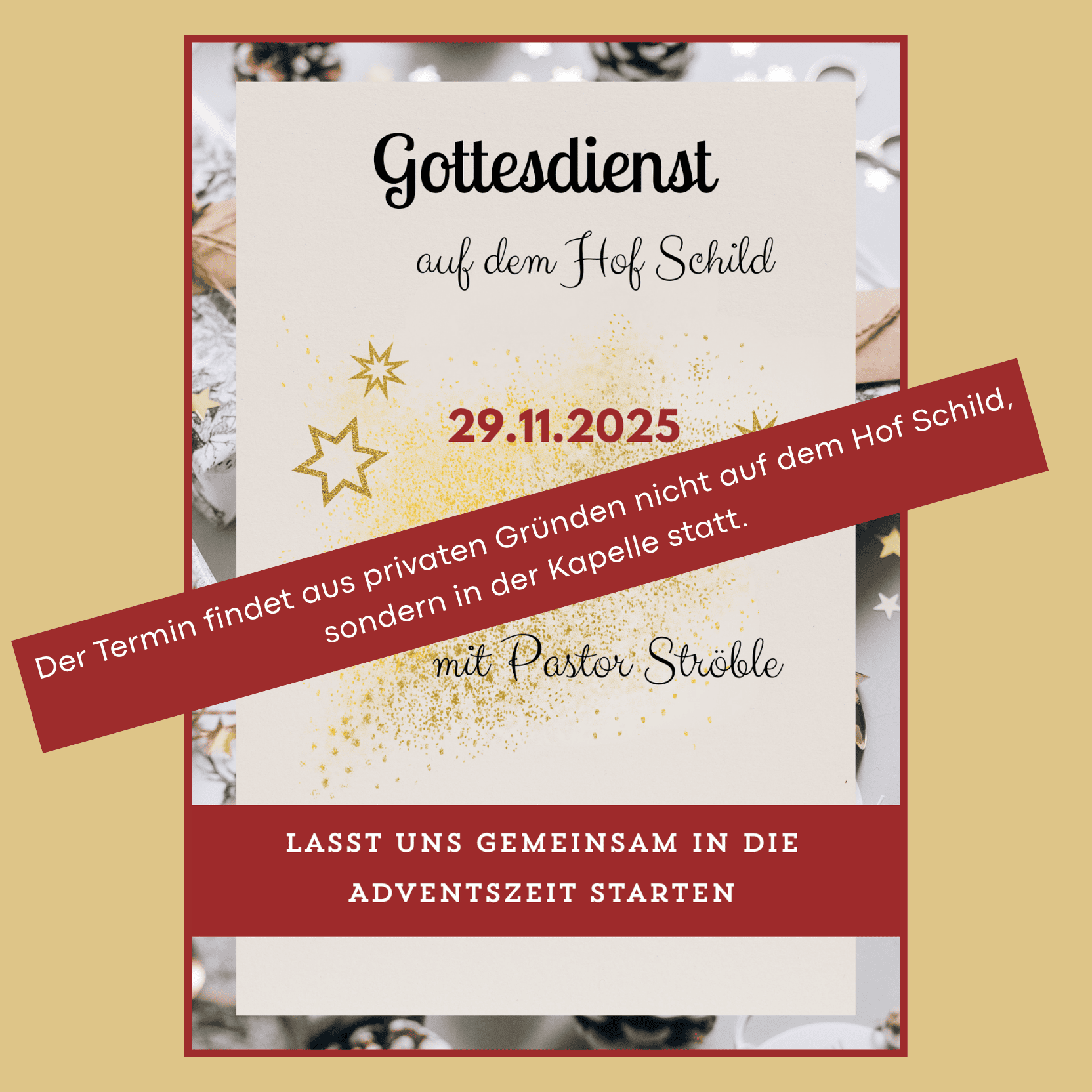 Hinweis: Aus privaten Gründen findet der Gottesdienst am 29. November 2025 nicht wie in den Kontakten angekündigt auf dem Hof Schild statt.