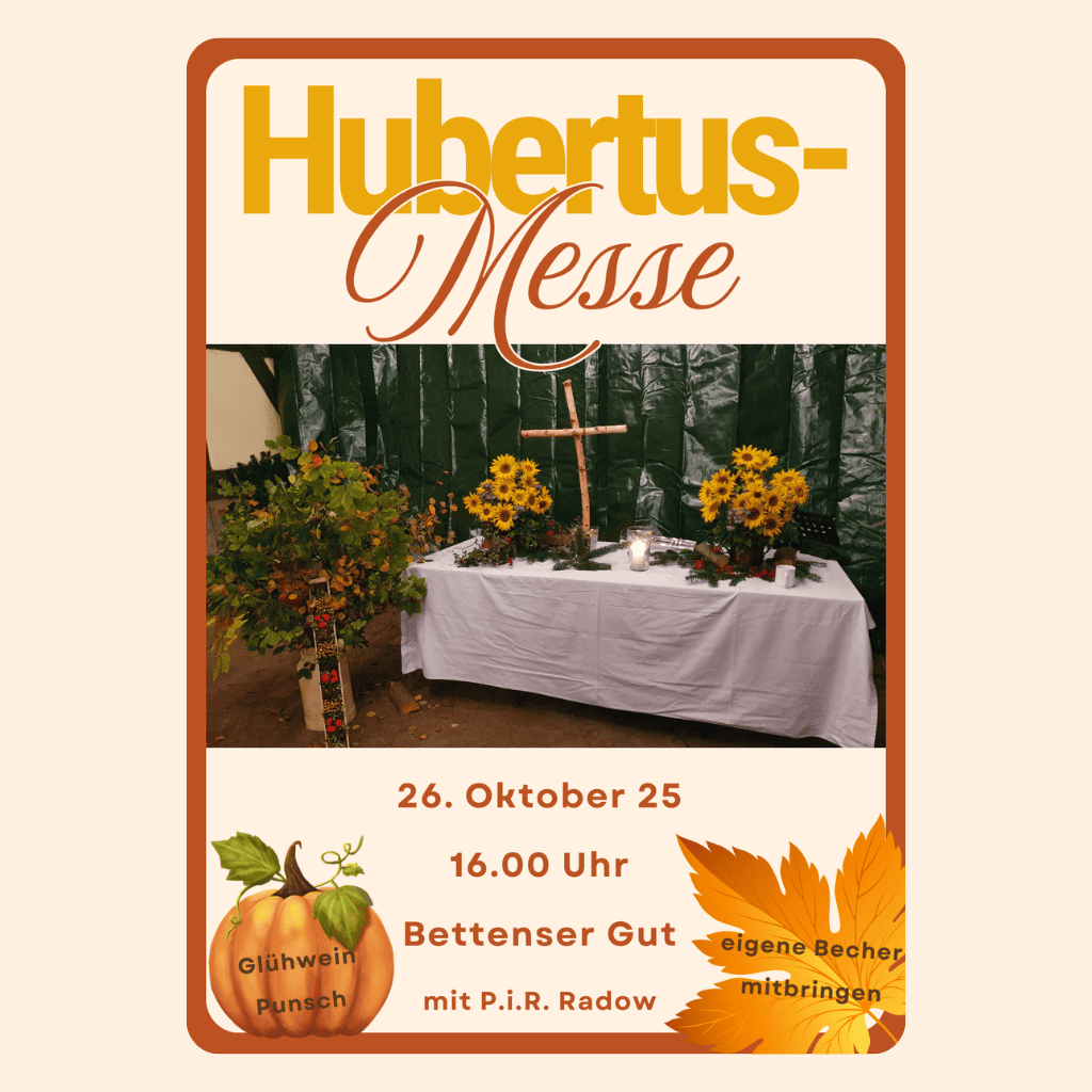Die Messe wird von P.i.R. Radow gestaltet und findet am Sonntag den, 26. Oktober 2025 um 16:00 Uhr statt.