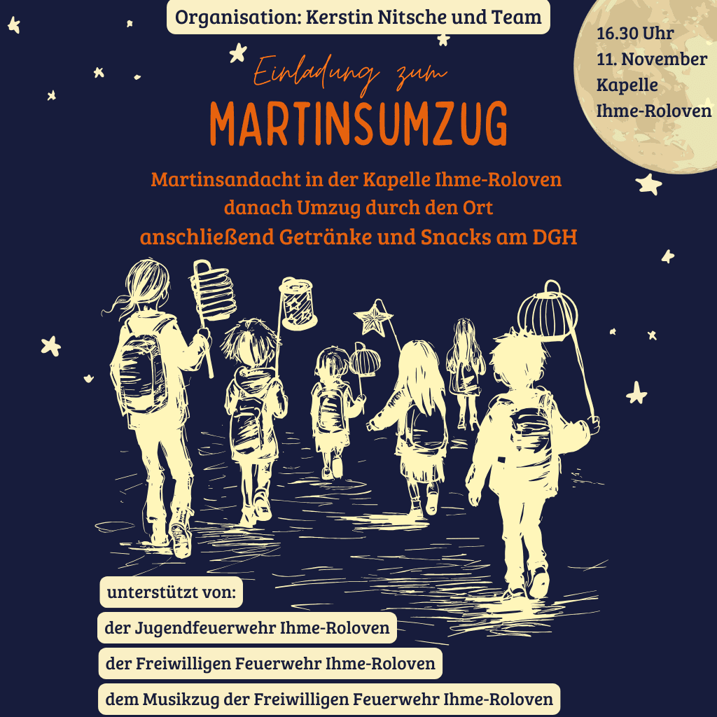 Im Anschluss ziehen wir gemeinsam mit Laternen durch unseren Ort und erinnern an die Geschichte des heiligen Martin, der mit anderen geteilt hat und damit ein Zeichen der Nächstenliebe setzte.