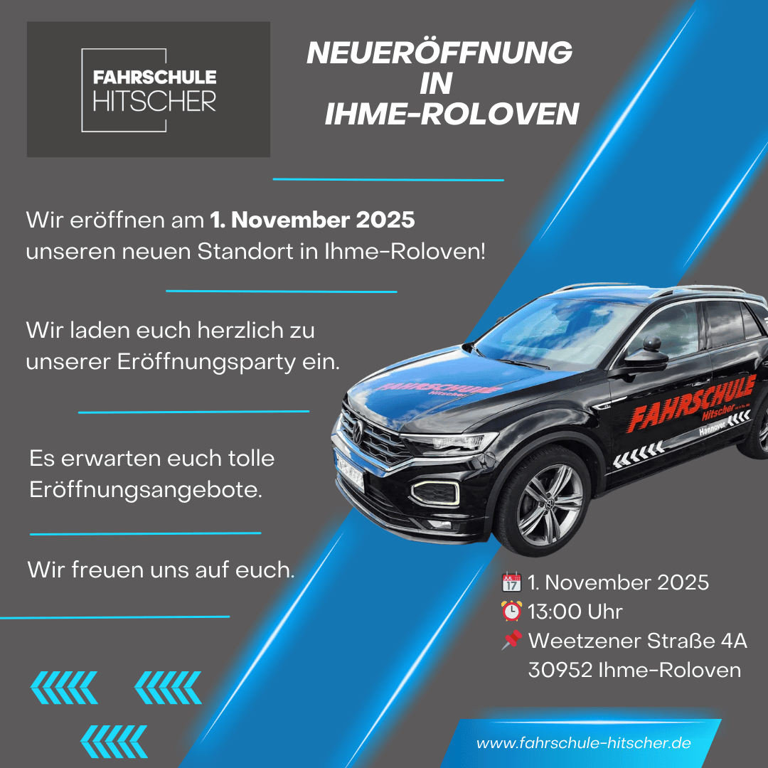 Am Dienstag, den 11. November 2025, ist es endlich soweit: Die Fahrschule Hitscher eröffnet ihren neuen Standort in Ihme-Roloven, Weetzner Straße 4A.