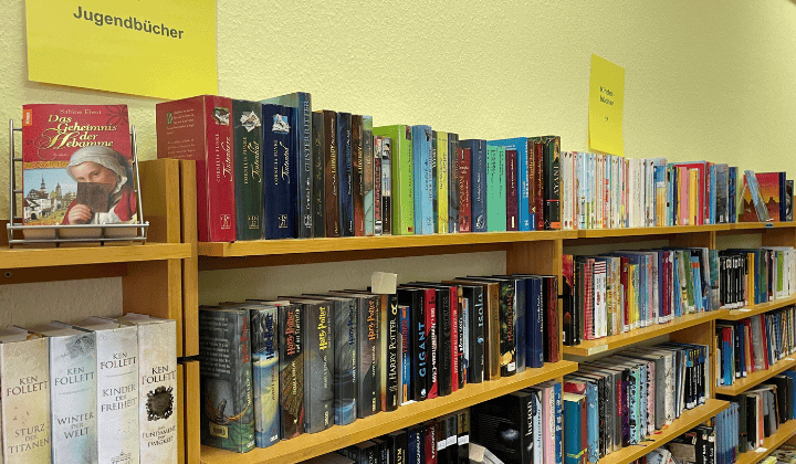 Der Bücherbestand mit ca. 3.000 Exemplaren besteht u.a. aus Bilderbüchern, Kinder – und Jugendromanen, Sachbüchern, Belletristik und Biografien für Erwachsene. Weiterhin stehen Hörbücher, CDs und DVDs zur Ausleihe bereit. Die Bücher können selbstständig ausgesucht und in gemütlichen Sitzsäcken unverzüglich studiert werden.